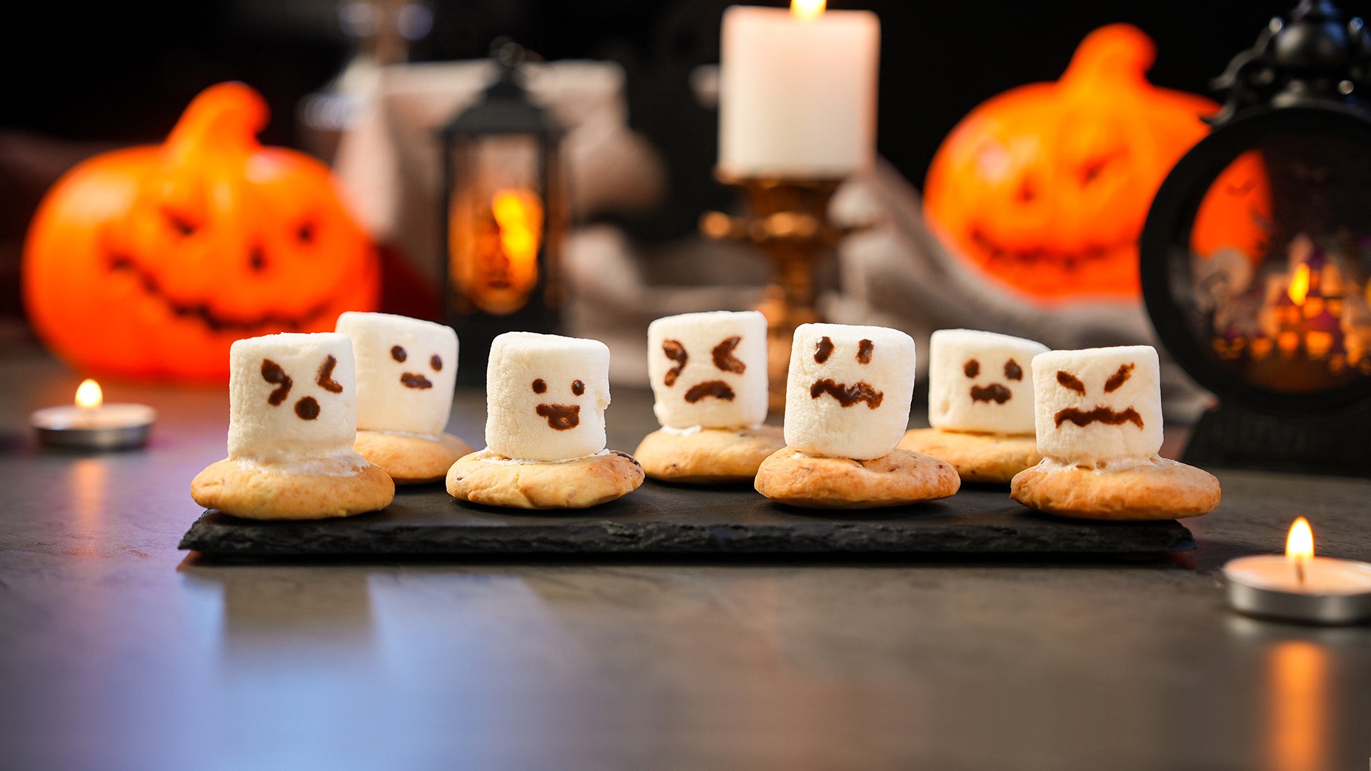 8. 熱いうちにマシュマロをのせ、チョコペンでおばけの顔を描いたら完成👻✨