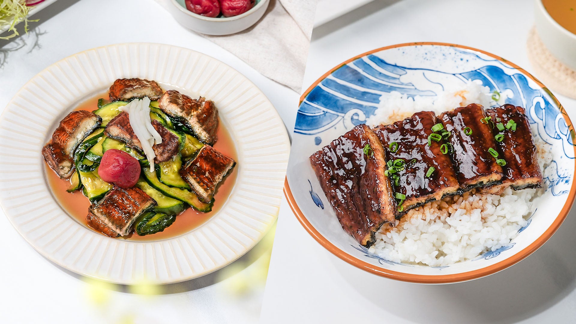 5. 皿にきゅうりを敷き、上に鰻をのせ、三杯酢をかけ、梅干しを添えて完成。
