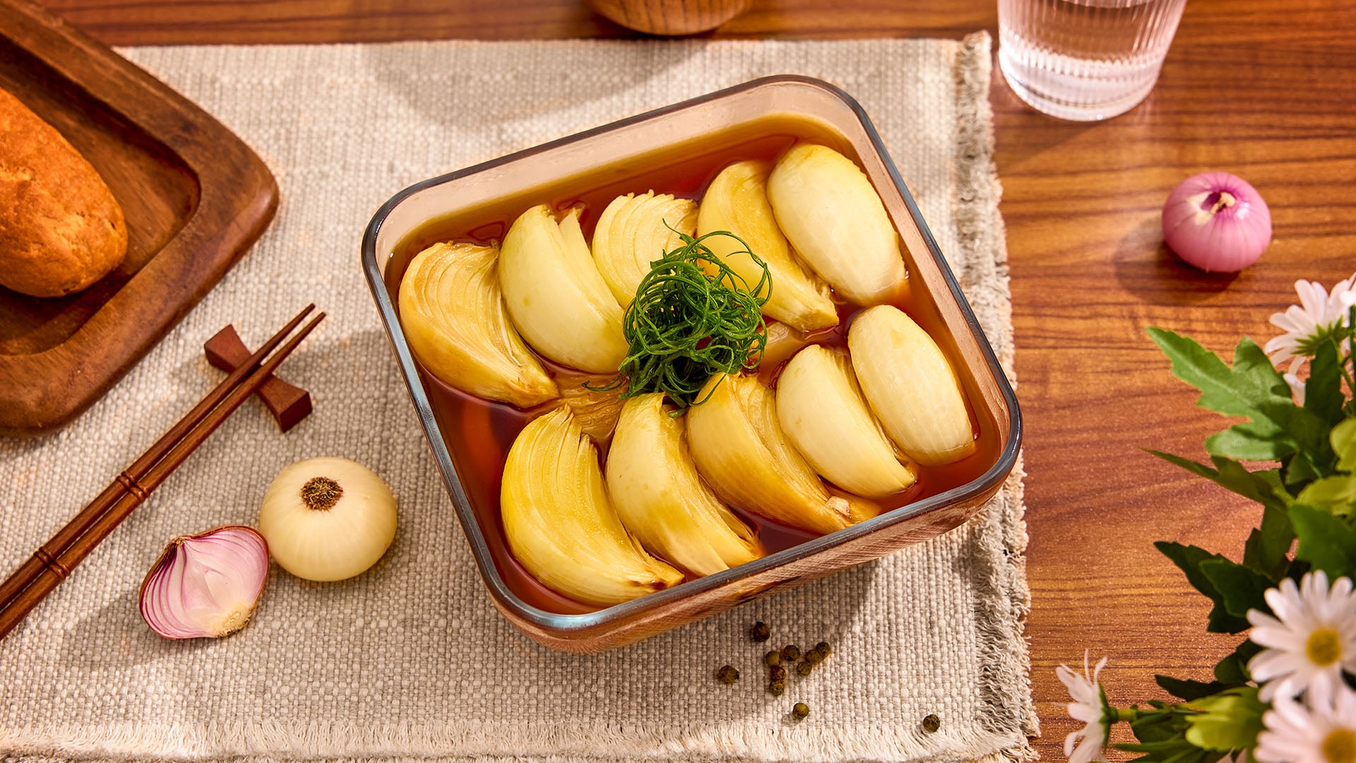 5. 焼き上げた玉ねぎをノンフライヤーから取り出し、4のマリネ液に全体が浸るように入れて、3時間程冷蔵庫で漬ける。