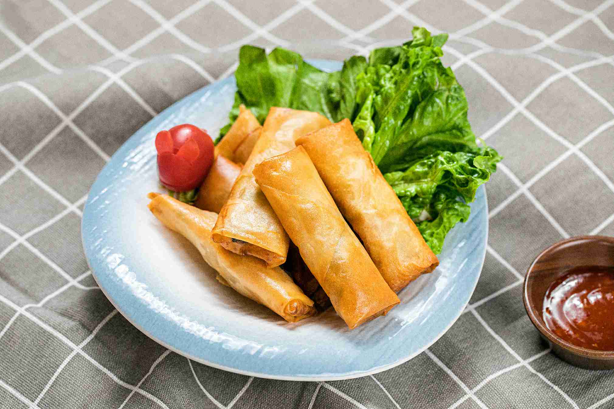 15. 春巻が焼けたら取り出し、キッチンペーパーを敷いたお皿に並べます。春巻は10分ほど休ませてからお召し上がりください。