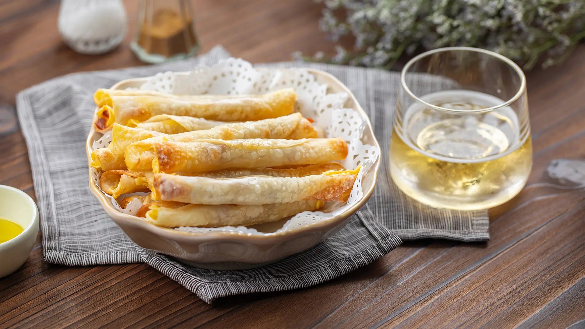 4、端からくるくると巻き、巻き終わりに水適量(分量外)を付けて閉じる。同様に計20個作る。