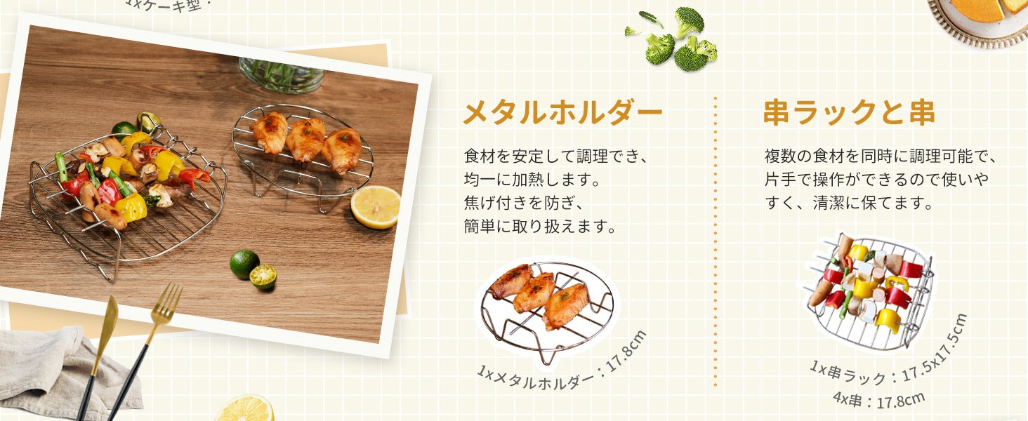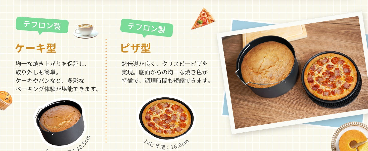 ケーキ、ピザ、焼き菓子、たこ焼き、串焼きなど、さまざまなお料理に対応しています。