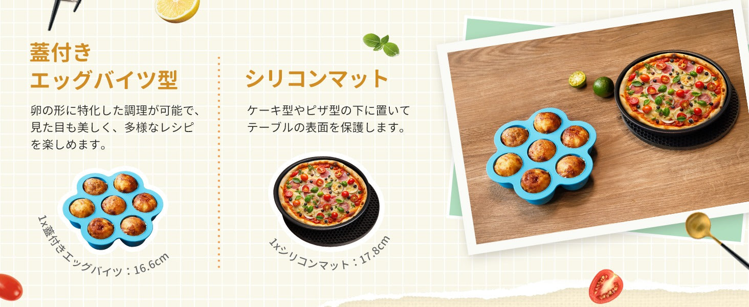 ケーキ型、ピザ型、蓋付きエッグバイツ、メタルホルダー、串ラックと串、シリコンマットの6点セットです。
