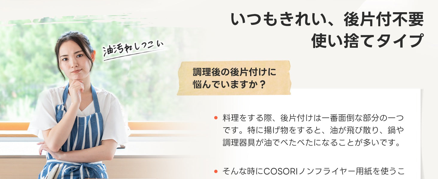 ノンフライヤー用紙を使用する場合、食材がバスケットやクリスパープレートに直接接触しないため、油や食材のカスがこびりつきにくく、清掃が楽になります。