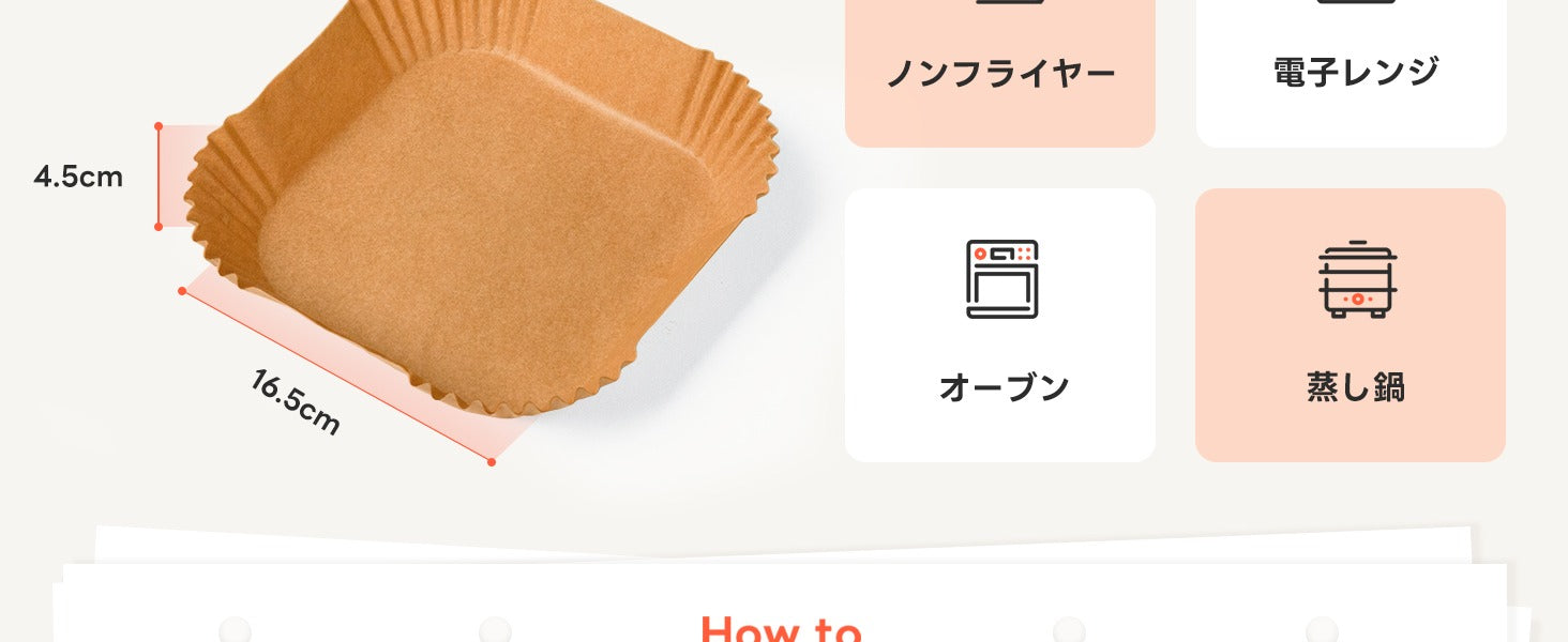 ・クッキングシートを使う際は、バスケット全体に敷き詰めないようにしてください。クッキングシートが通気孔を塞いでしまうと、食材がうまく焼けなくなります。食材の下に部分的に敷くと良いです。