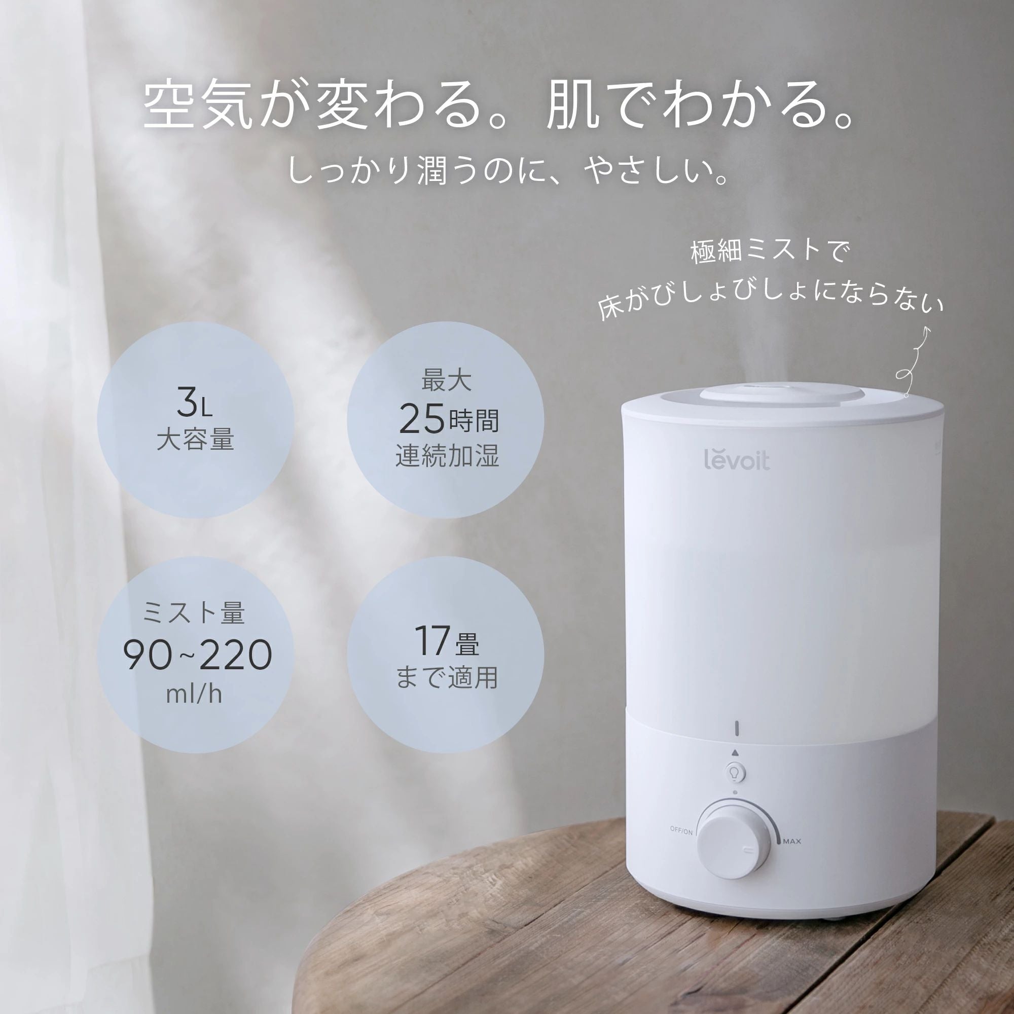 ③加湿力と静音性を兼ね備え、ミスト量は90ml/hから最大220ml/hまで調整可能!じんわり加湿し、周囲がびしょびしょになる心配もありません。子供部屋や寝室に最適です!