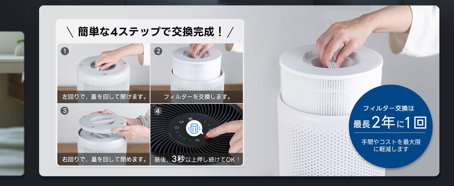 空気清浄機のフィルター交換について、製品及び実際のご使用状況・利用環境によって異なります。
