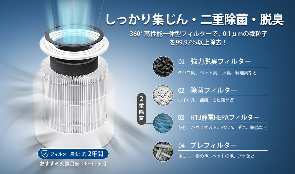 フィルターの寿命は概ね2年とされていますが、より良い性能を持続的に体感していただくために、6〜12か月の周期でのフィルター交換をお勧めしております。