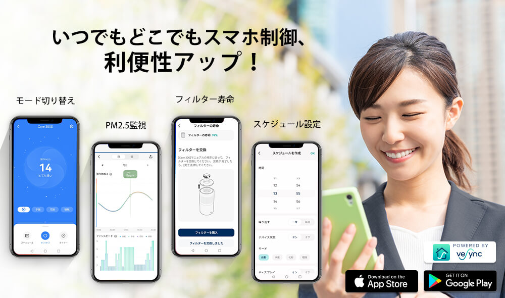 専用VeSyncアプリを通じて、空気清浄機の状態確認やタイマー、スケジュール、モードの切り替えなどの設定変更ができます。